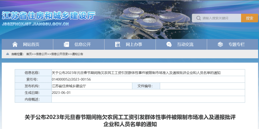 6月1日,江蘇省住房和城鄉(xiāng)建設(shè)廳公開(kāi)消息,對(duì)2023年元旦春節(jié)期間因拖欠農(nóng)民工工資引發(fā)群體性事件的126家企業(yè)予以全省范圍內(nèi)限制建筑市場(chǎng)準(zhǔn)入,對(duì)44家企業(yè)予以全省通報(bào)批評(píng)。