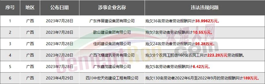 廣西6家房企、建企欠薪被通報(bào)或處罰,涉及金額564.52萬(wàn)元