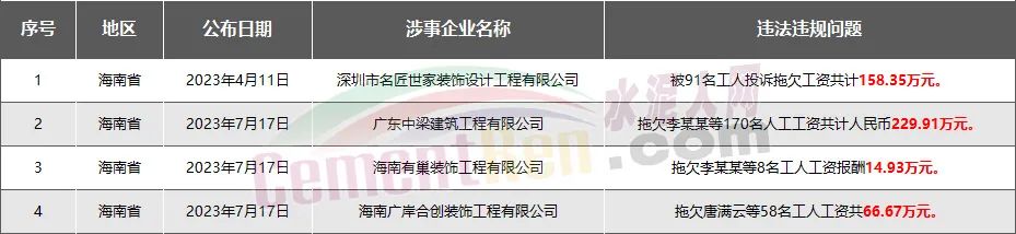 海南省4家房企、建企欠薪被通報(bào)或處罰,涉及金額469.86萬(wàn)元