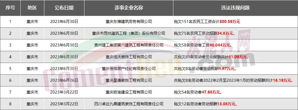 重慶市8家房企、建企欠薪被通報(bào)或處罰,涉及金額538.34萬(wàn)元