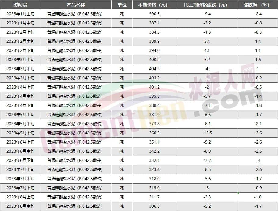 近日,國家統(tǒng)計局公布2023年8月中旬流通領(lǐng)域重要生產(chǎn)資料市場價格變動情況顯示,普通硅酸鹽水泥(P.O42.5散裝)水泥報價306.5元/噸,已是自3月下旬以來連續(xù)第15次價格下跌,且為自5月上旬以來第11次突破年內(nèi)最低價。