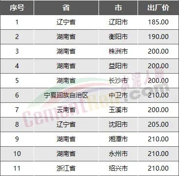 水泥人網(wǎng)信息數(shù)據(jù)顯示,8月中下旬,全國PO42.5散裝水泥價格最低的前10個地區(qū)為遼陽市、衡陽市、株洲市、益陽市、長沙市、中衛(wèi)市、玉溪市、沈陽市、湘潭市、永州市、紹興市,P.O42.5散裝水泥出廠報價均在210元/噸以下。前十地區(qū)中,僅湖南省就占了6個地區(qū)。