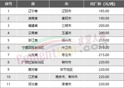 全國PO42.5散裝水泥價格最低的前10個省市為遼寧省、湖南省、福建省、云南省、浙江省、寧夏回族自治區(qū)、山東省、廣西壯族自治區(qū)、貴州省、江蘇省、河北省,P.O42.5散裝水泥出廠報價均在220元/噸以下。
