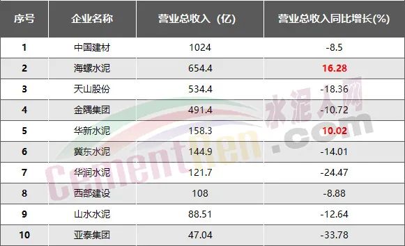 營(yíng)業(yè)總收入排名前十為:中國(guó)建材、海螺水泥、天山股份、金隅集團(tuán)、華新水泥、冀東水泥、華潤(rùn)水泥、西部建設(shè)、山水水泥、亞泰集團(tuán)。上半年,營(yíng)業(yè)收入保持增長(zhǎng)的企業(yè)只有寧夏建材、海螺水泥、塔牌集團(tuán)、華新水泥、西部水泥、青松建化6家。