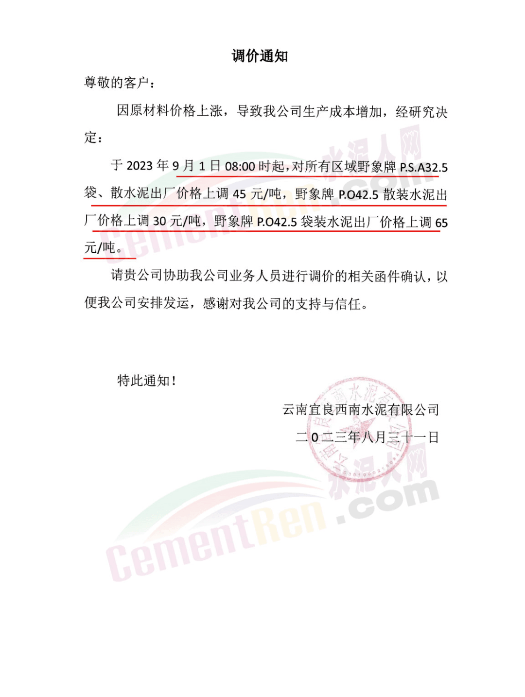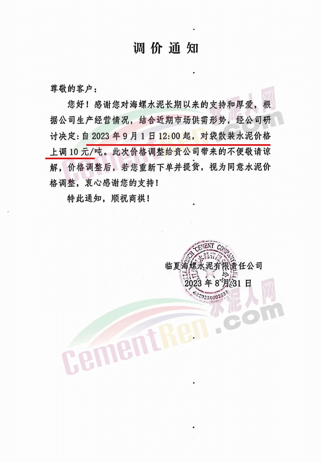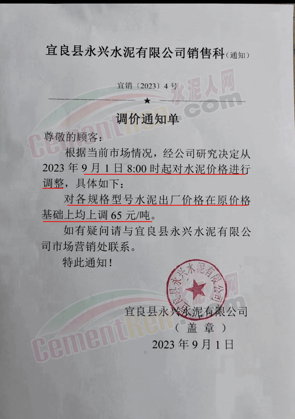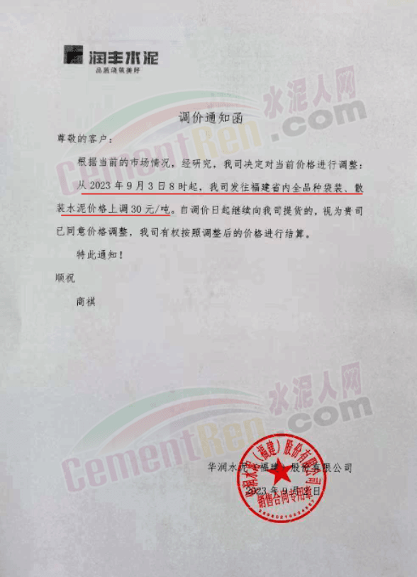 福建三明南方水泥有限公司通知,根據(jù)目前市場(chǎng)行情,經(jīng)公司研究決定,自2023年9月3日零時(shí)起公司各品種袋裝、散裝水泥出廠價(jià)在原有基礎(chǔ)上上調(diào)30元/噸。
