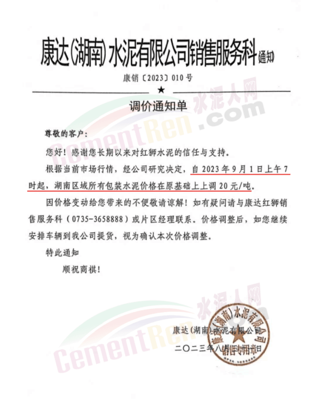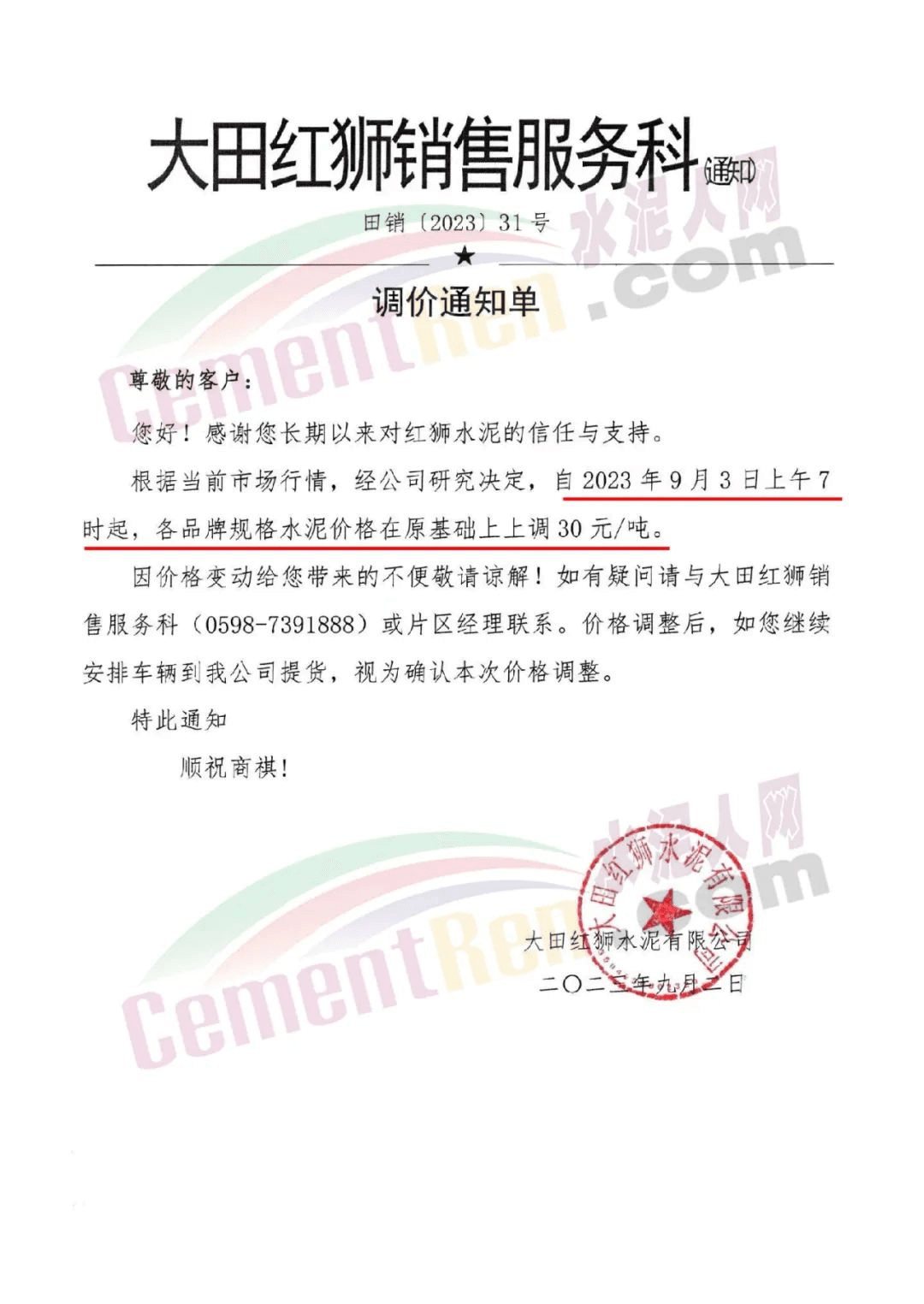 龍海紅獅、大田紅獅銷售服務(wù)科通知,根據(jù)當(dāng)前市場(chǎng)行情,經(jīng)公司研究決定,自2023年9月3日上午7時(shí)起,各品牌各規(guī)格品種水泥價(jià)格在原基礎(chǔ)上上調(diào)30元/噸。