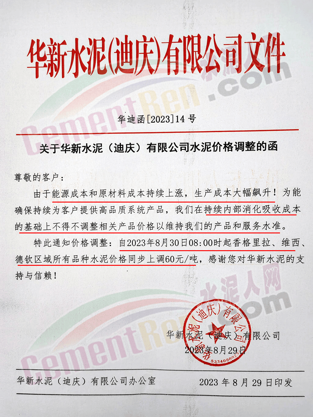 福建省南安市華龍水泥有限公司通知,根據(jù)市場(chǎng)情況,經(jīng)研究決定從2023年9月4日零時(shí)起,發(fā)往福建省內(nèi)各區(qū)域、各品種各規(guī)格型號(hào)水泥在原價(jià)格基礎(chǔ)上上調(diào)30元/噸。