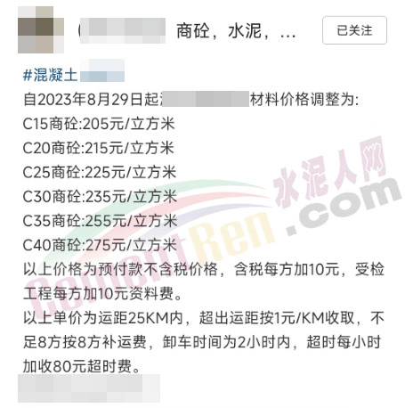 山東一家商砼站通知,自8月29日起調(diào)整材料價(jià)格。并提示報(bào)價(jià)為預(yù)付款不含稅價(jià)格,含稅每方再加10元,受檢工程每方再加10元資料費(fèi)。單價(jià)為運(yùn)距25公里內(nèi),超出運(yùn)距按1元/公里收取,卸車時(shí)間為2小時(shí)內(nèi),超時(shí)每小時(shí)加收80元超時(shí)費(fèi)。