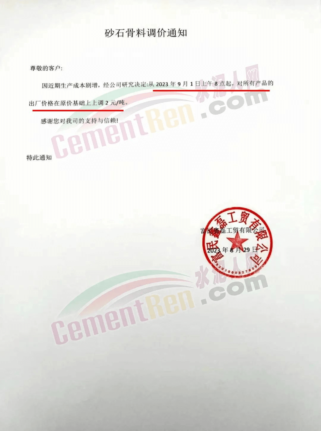 華新水泥(富民)有限公司通知稱,受電力供應(yīng)緊張、環(huán)保投資及資源稅等影響,導(dǎo)致生產(chǎn)成本大幅度增加,經(jīng)公司慎重研究決定:自2023年9月1日8時(shí)起,公司所有品種骨料出廠價(jià)在原執(zhí)行價(jià)格基礎(chǔ)上上調(diào)2元/噸。