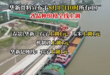 另?yè)?jù)市場(chǎng)反饋,華新骨料曾于8月17日0時(shí)上調(diào)所有工廠產(chǎn)品價(jià)格。