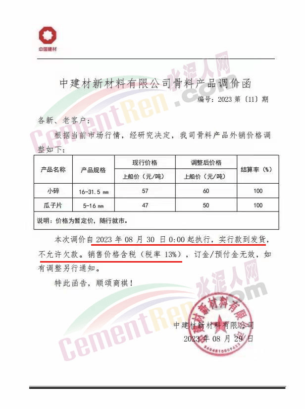 中建材新材料有限公司通知,根據(jù)當(dāng)前市場(chǎng)行情經(jīng)研究決定,公司骨料產(chǎn)品小碎16-31.5mt及瓜子片5-16m外銷價(jià)格,自8月30日0時(shí)起上調(diào)3元/噸。實(shí)行款到發(fā)貨,不允許欠款。銷售價(jià)格含稅(稅率13%),訂金/預(yù)付金無(wú)效。