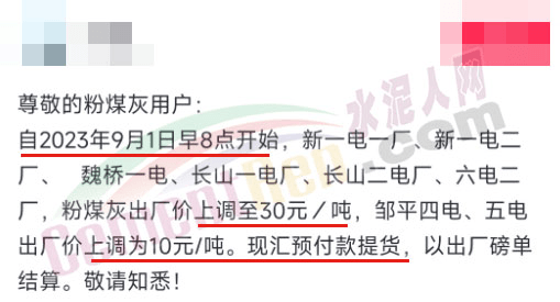 據(jù)山東貿(mào)易商通知,自2023年9月1日早8點(diǎn)開始,新一電一廠、新一電二魏橋一電、長(zhǎng)山一電廠、長(zhǎng)山二電廠、六電二廠,粉煤灰出廠價(jià)上調(diào)至30元/噸,鄒平四電、五電出廠價(jià)上調(diào)為10元/噸。現(xiàn)匯預(yù)付款提貨,以出廠磅單結(jié)算。