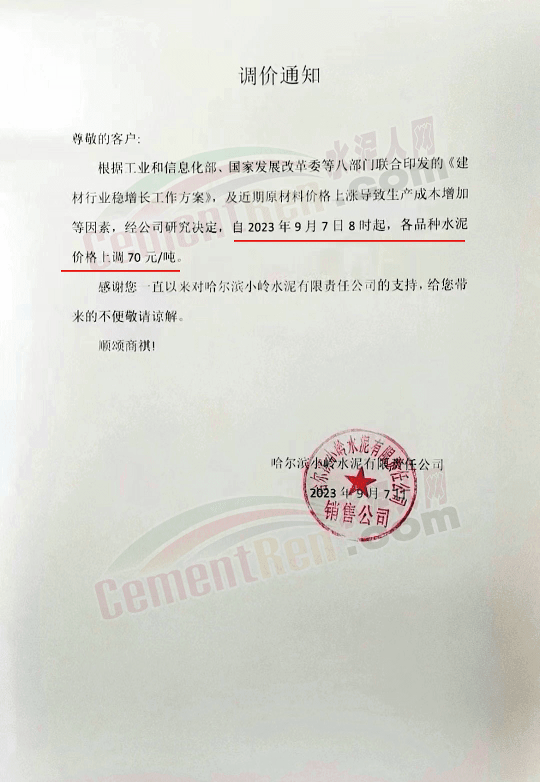 遼寧金隅冀東水泥貿(mào)易有限公司通知,由于生產(chǎn)成本大幅度提高等因素影響,經(jīng)公司研究決定從2023年9月7日早上8時起,對銷售到哈爾濱地區(qū)的所有品種水泥價格在原價格基礎(chǔ)上上調(diào)70元/噸。