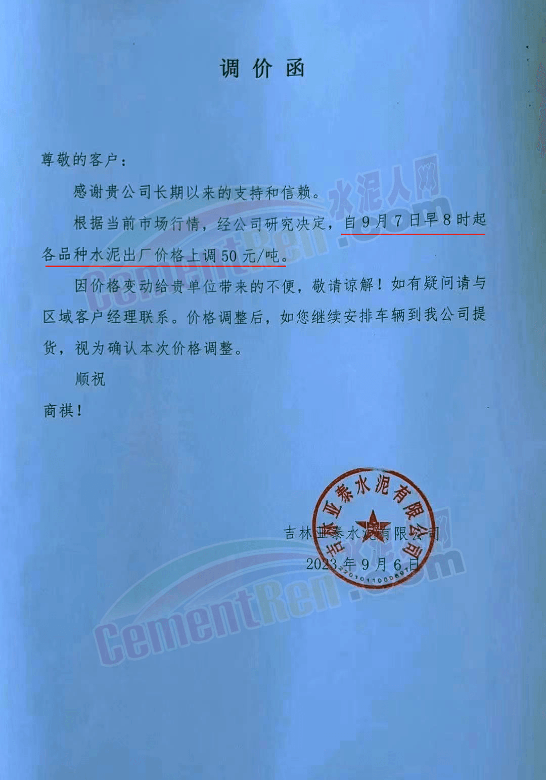 遼寧金隅冀東水泥貿(mào)易有限公司通知,由于生產(chǎn)成本大幅度提高的影響,經(jīng)公司研究決定自2023年9月7日8時起,對銷售至吉林省地區(qū)的所有品種水泥價格在原價格基礎(chǔ)上調(diào)50元/噸。