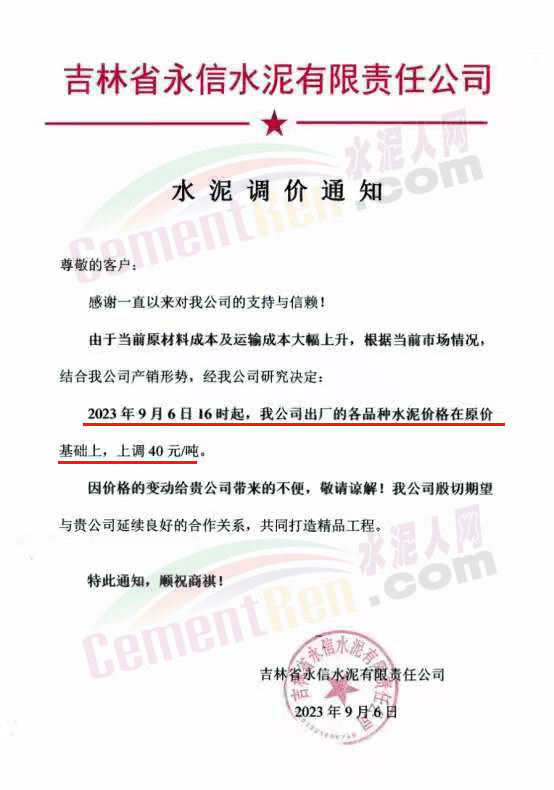 吉林省永信水泥有限責(zé)任公司通知由于當(dāng)前原材料成本及運輸成本大幅上升,根據(jù)當(dāng)前市場情況,結(jié)合公司產(chǎn)銷形勢,經(jīng)研究決定:2023年9月6日16時起,公司出廠的各品種水泥價格在原價基礎(chǔ)上,上調(diào)40元/噸。