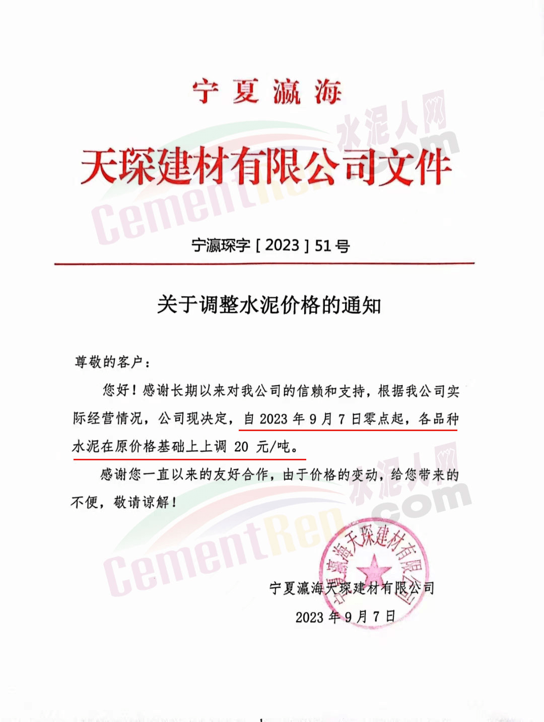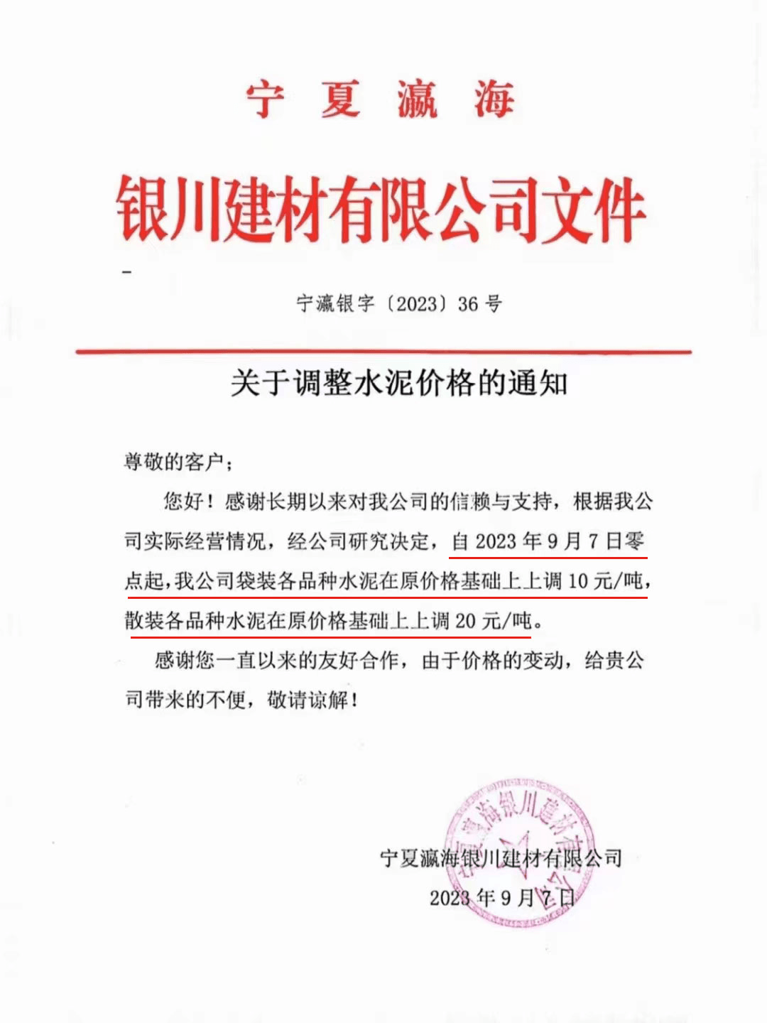 寧夏瀛海天琛建材有限公司通知,根據(jù)公司實際經(jīng)營情況,公司決定,自2023年9月7日零點起,各品種水泥在原價格基礎(chǔ)上上調(diào)20元/噸。