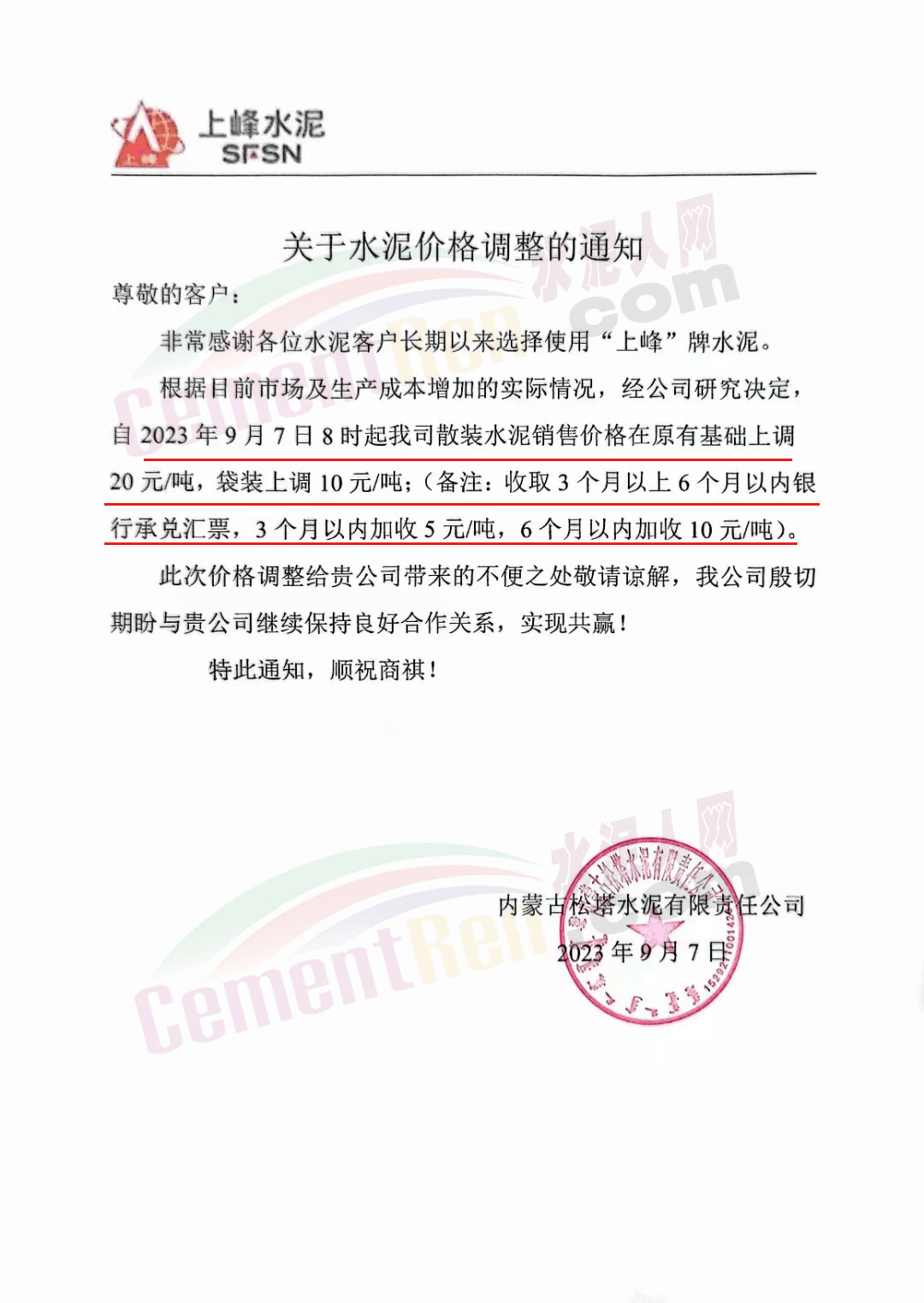 內(nèi)蒙古松塔水泥有限責(zé)任公司通知,根據(jù)目前市場及生產(chǎn)成本增加的實際情況,經(jīng)公司研究決定自2023年9月7日8時起散裝水泥銷售價格在原有基礎(chǔ)上調(diào)20元/噸,袋裝上調(diào)10元/噸;并提示,收取3個月以上6個月以內(nèi)銀行承兌匯票,3個月以內(nèi)加收5元/噸,6個月以內(nèi)加收10元/噸。
