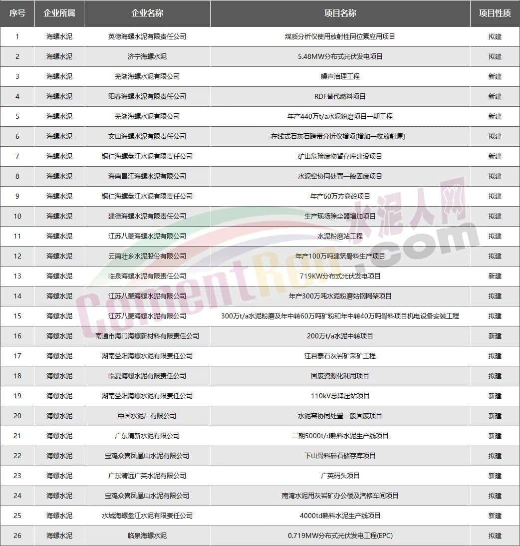 據(jù)水泥人網(wǎng)不完全統(tǒng)計,2023年下半年以來,中建材集團(tuán)、海螺水泥、華新水泥、華潤水泥、金隅集團(tuán)、紅獅控股集團(tuán)、山水水泥、臺泥水泥旗下共有304個新建擬建項目,其中光伏、骨料、混凝土、水泥窯協(xié)同處置、智能化相關(guān)項目居多。