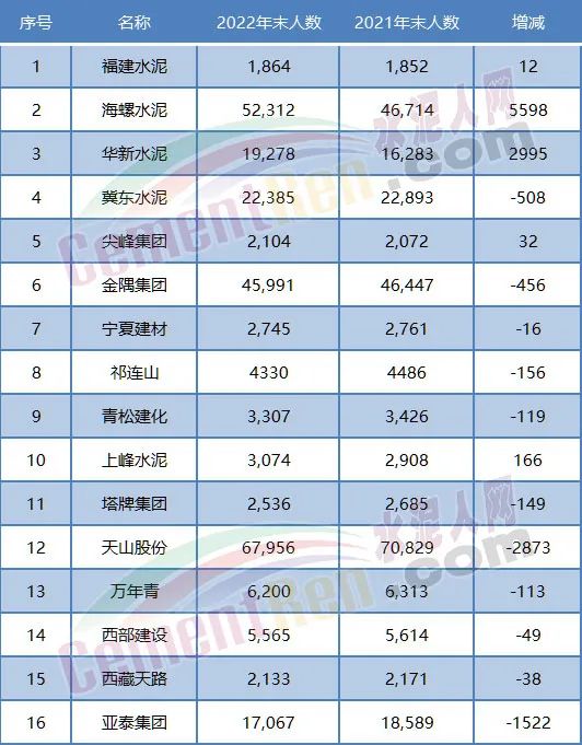 據(jù)不完全統(tǒng)計,從2019~2022年金隅集團、冀東水泥、亞泰集團員工都有千人以上的減員,萬年青、祁連山、塔牌水泥均有百人以上的減員。2021~2022年金隅集團、冀東水泥、萬年青、祁連山、塔牌集團、青松建化等均有百人以上的減員,冀東水泥減員達500多人。然而,從水泥行業(yè)未來長遠的發(fā)展來看,這才是剛剛開始。