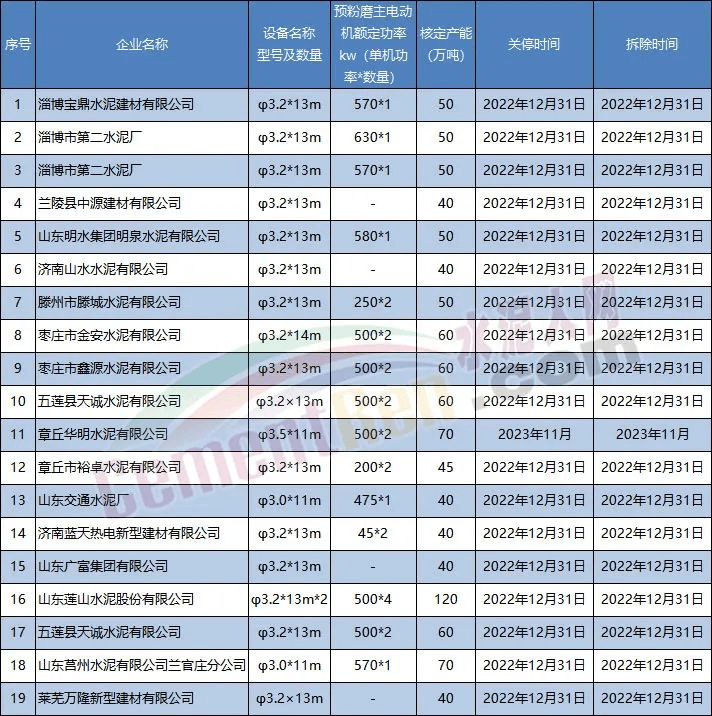 據(jù)水泥人網(wǎng)不完全統(tǒng)計(jì),今年1-7月,山東省公告用于置換或補(bǔ)齊產(chǎn)能退出的粉磨生產(chǎn)線共20條,關(guān)停拆除時(shí)間多在2022年12月31日。