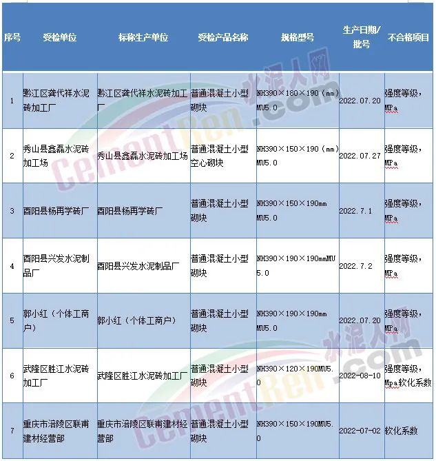 今年8月15日重慶市市場監(jiān)督管理局發(fā)布的通告文件顯示,抽查涉及黔江區(qū)、彭水縣、酉陽縣、秀山縣、涪陵區(qū)、武隆區(qū)、石柱縣等7個區(qū)縣的48批次普通混凝土小型砌塊產(chǎn)品中,發(fā)現(xiàn)7批次產(chǎn)品不合格。不合格項目涉及軟化系數(shù)、強度等級,不合格率達14.58%。