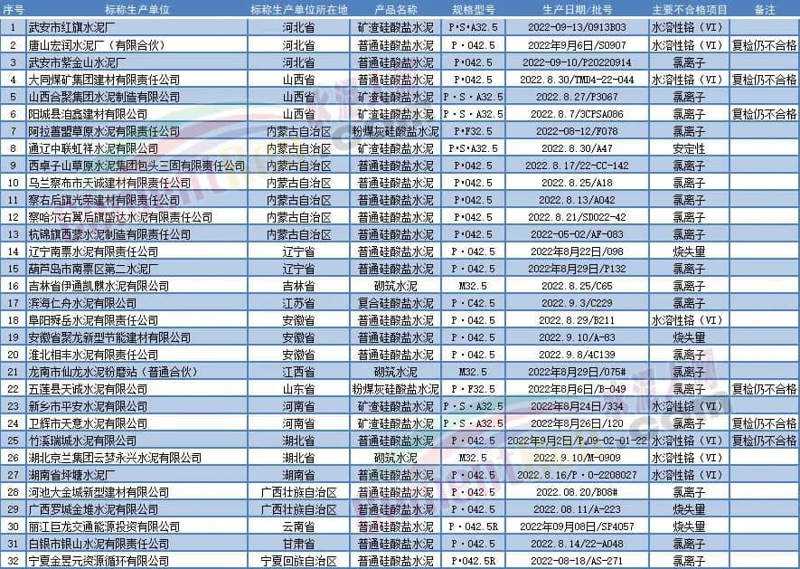 另據(jù)了解,4月6日,市場監(jiān)管總局通報2022年建筑材料產(chǎn)品質(zhì)量國家監(jiān)督抽查情況顯示,共抽查28個省(區(qū)、市)961家企業(yè)生產(chǎn)的961批次水泥,發(fā)現(xiàn)32批次產(chǎn)品不合格,不合格項目涉及燒失量、氯離子、水溶性鉻(Ⅵ)、安定性等,其中8批次水溶性鉻和19批次氯離子不合格,在問題水泥中占比相對較高。