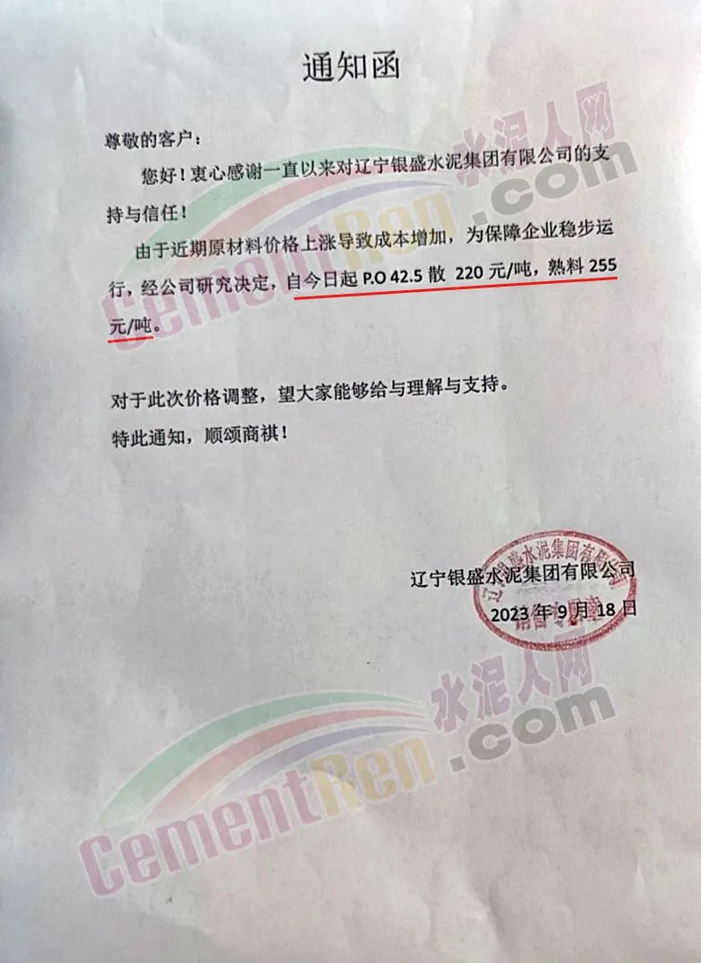 臺泥(遼寧)水泥有限公司通知,鑒于原材料價格的持續(xù)上漲造成生產成本的大幅上漲。經結合市場實際情況,公司研究決定,自2023年9月18日8時起,臺泥水泥熟料銷售價格執(zhí)行255元/噸,42.5散裝水泥銷售價格執(zhí)行220元/噸。