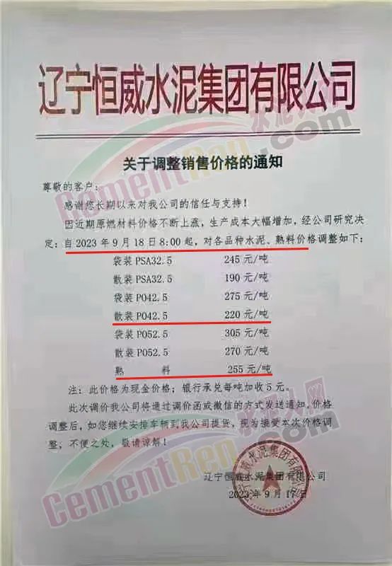 遼寧恒威水泥集團有限公司通知,因近期原燃材料價格不斷上漲,生產成本大幅增加,經公司研究決定:自2023年9月18日8:00起,對各品種水泥、熟料價格調整。調整后熟料報價255元/噸,散裝P.O42.5水泥報價220元/噸。