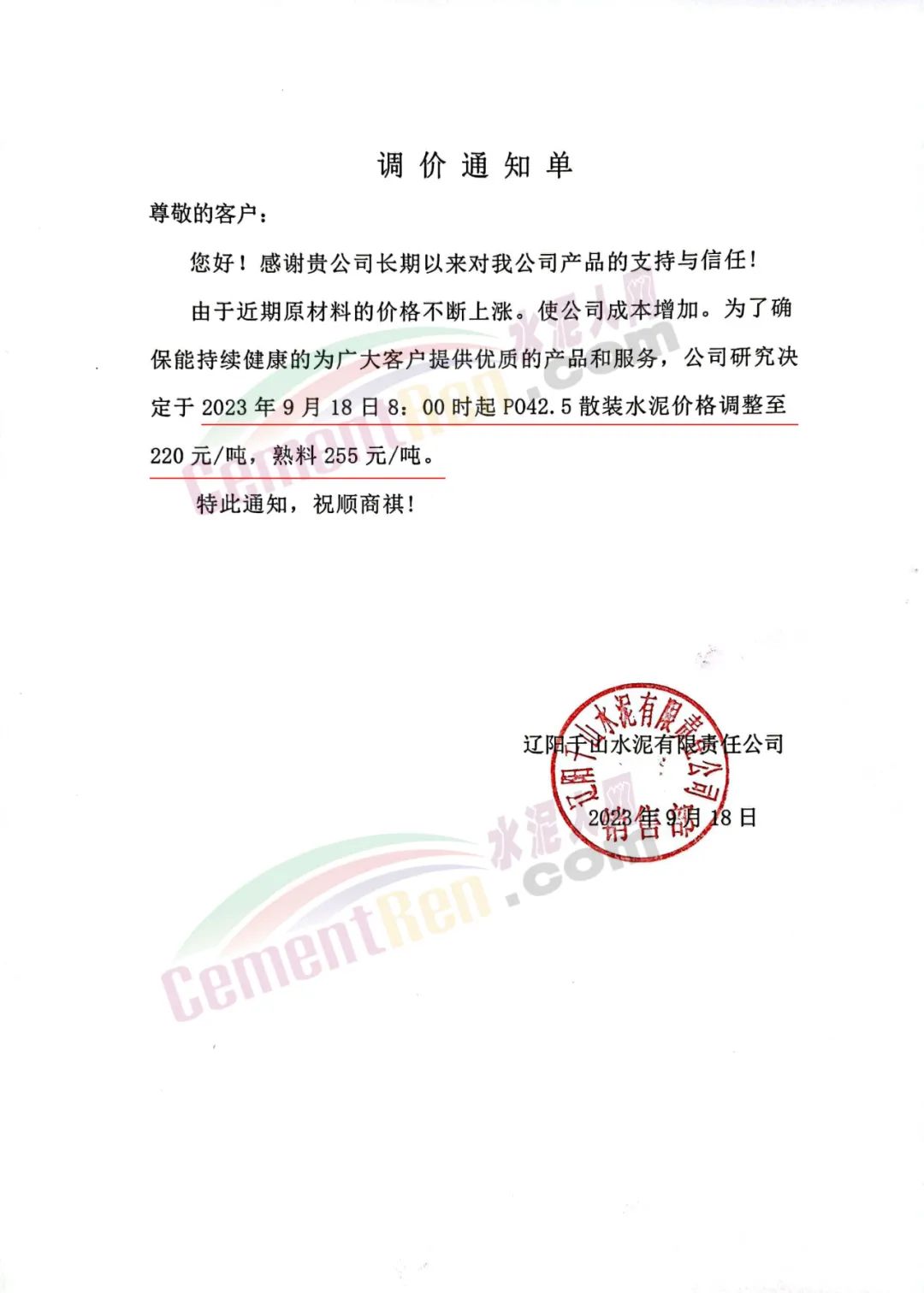 遼陽天瑞水泥有限公司通知,由于近期生產成本增加等因素,根據(jù)目前市場情況,經公司研究決定:自2023年9月18日8:00起執(zhí)行新報價。其中P.O42.5散裝水泥出廠含稅報價220元/噸。熟料報價255元/噸。