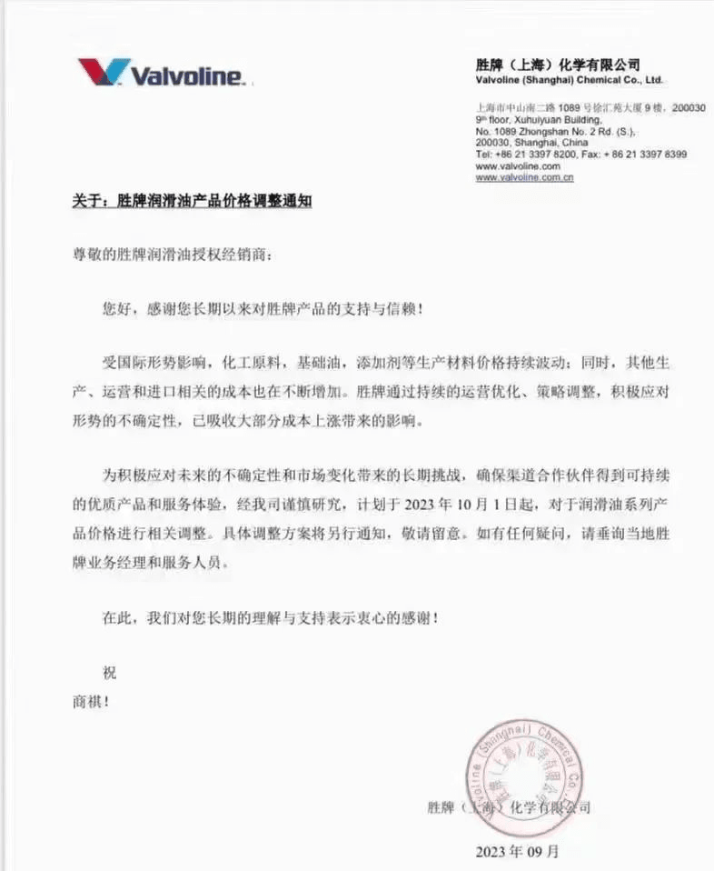 近日,勝牌、殼牌和突破潤滑油發(fā)布了關(guān)于調(diào)整潤滑油產(chǎn)品價(jià)格通告,宣布對(duì)產(chǎn)品價(jià)格進(jìn)行適度上調(diào),預(yù)計(jì)漲幅為5%左右。