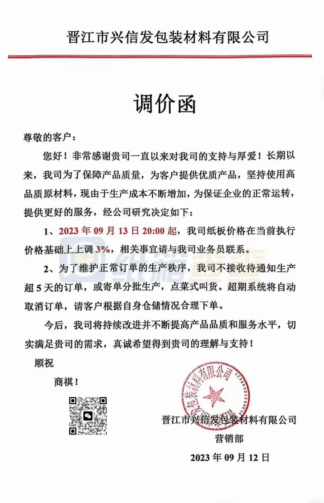 晉江市興信發(fā)包裝材料:從2023年9月13日20:00起,紙板價(jià)格在當(dāng)前執(zhí)行價(jià)格基礎(chǔ)上上調(diào)3%。