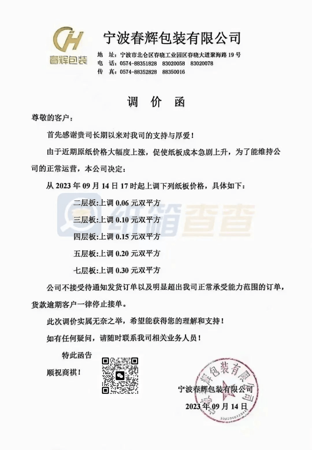 寧波春輝包裝:從2023年9月14日17時(shí)起,具體如下:二層板:上調(diào)0.06元雙平方;三層板:上調(diào)0.10元雙平方四層板:上調(diào)0.15元雙平方五層板:上調(diào)0.20元雙平方;七層板:上調(diào)0.30元雙平方。