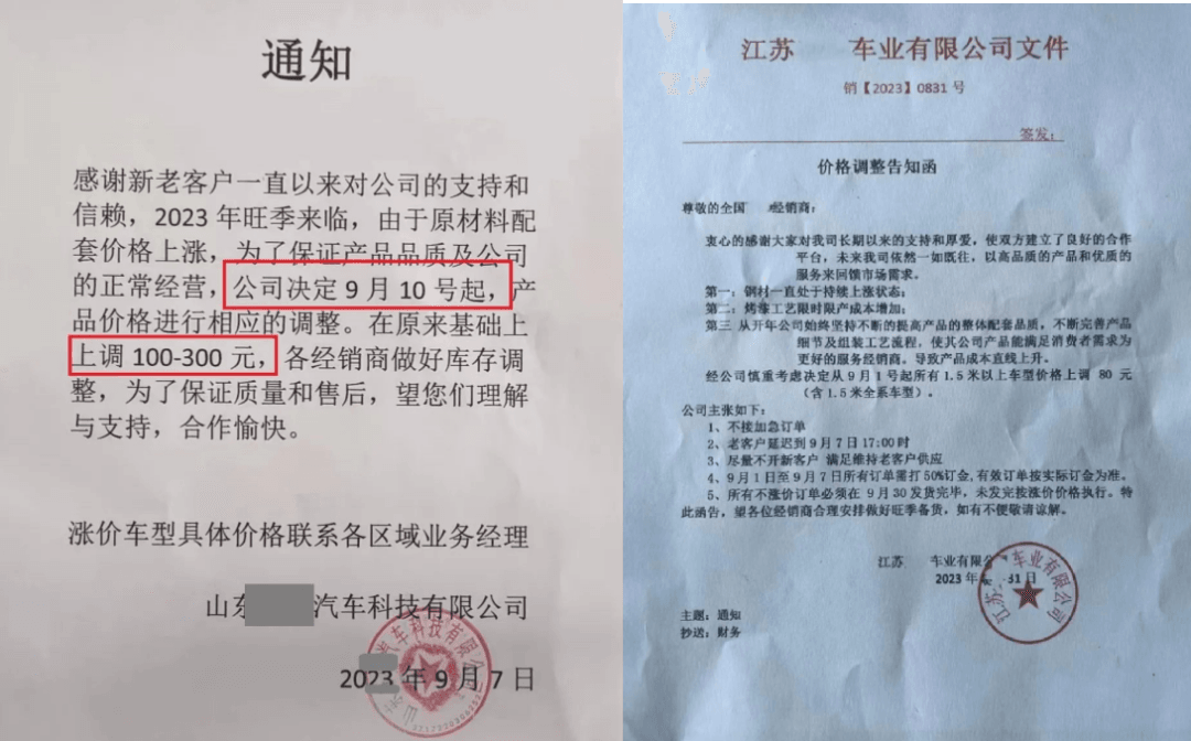 多個(gè)整車廠家自9月10日起,在8月份上調(diào)基礎(chǔ)上價(jià)格再次上調(diào),兩輪車、三輪車、四輪車或?qū)⒂瓉韼资綆装僭坏鹊臐q價(jià)幅度,各三輪車、篷車、微電轎車型漲價(jià)幅度在120——300元不等,目前漲價(jià)潮已蔓延至全國市場。