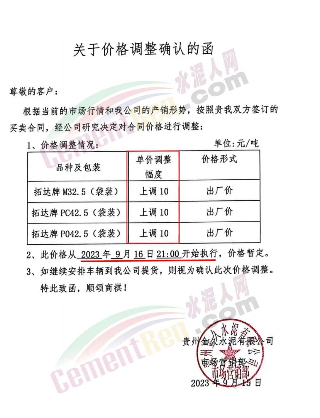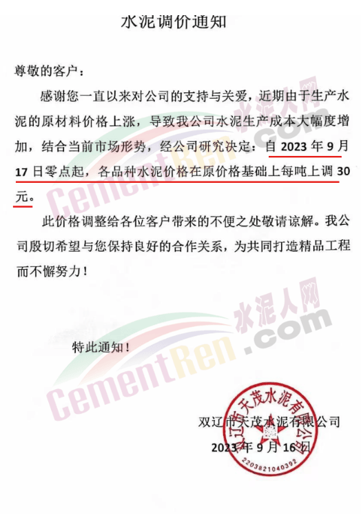 貴州黃平尖峰水泥通知,因近期原燃材料價(jià)格持續(xù)上漲,導(dǎo)致水泥生產(chǎn)成本大幅上升,經(jīng)公司研究決定自2023年9月21日8時(shí)起,黔東南州區(qū)域的各品種袋、散裝水泥銷(xiāo)售價(jià)格在原基礎(chǔ)上上調(diào)30元/噸。銅仁區(qū)域的各品種袋、散裝水泥銷(xiāo)售價(jià)格在原基礎(chǔ)上上調(diào)20元/噸。