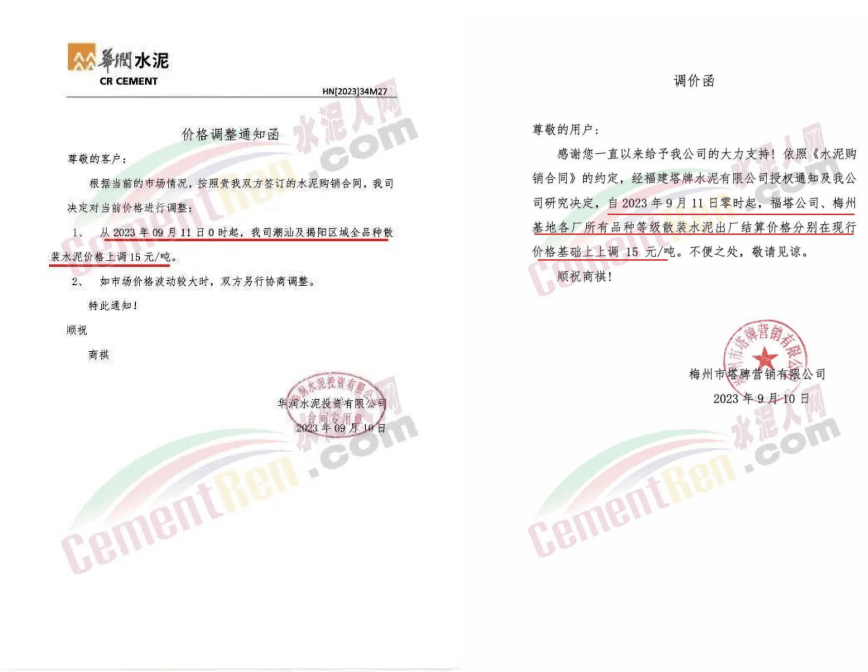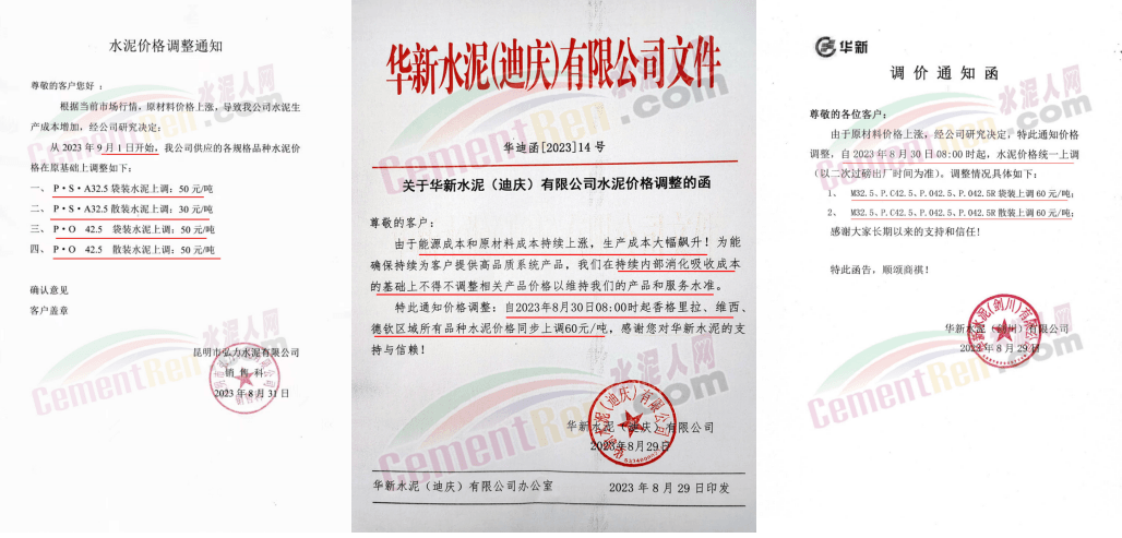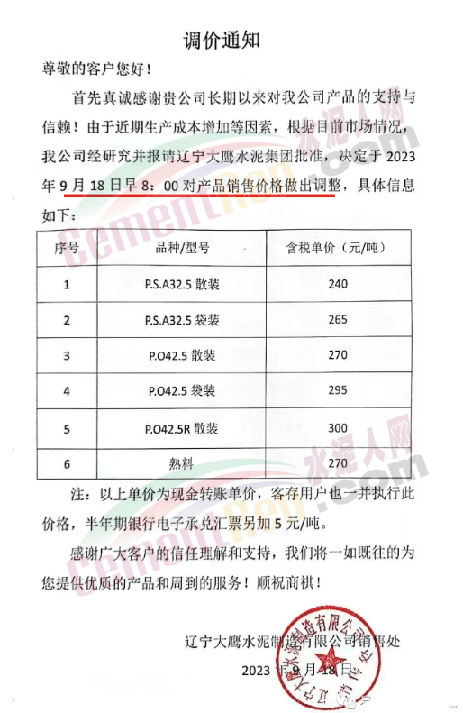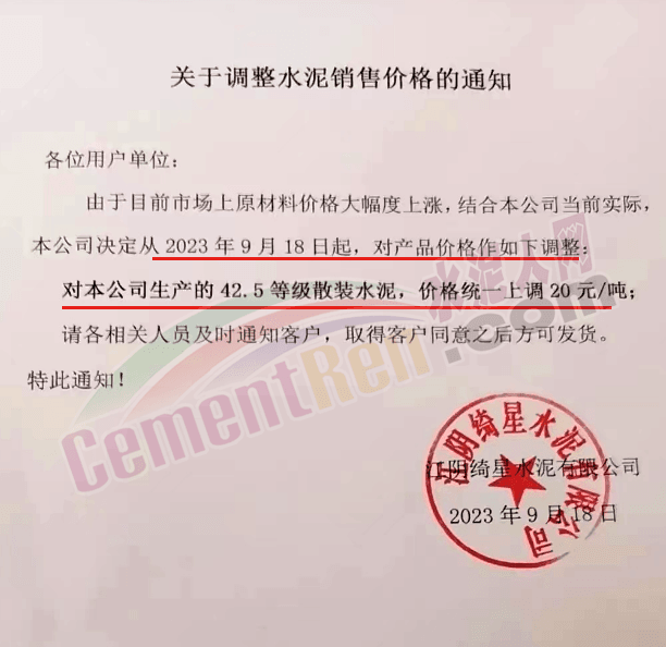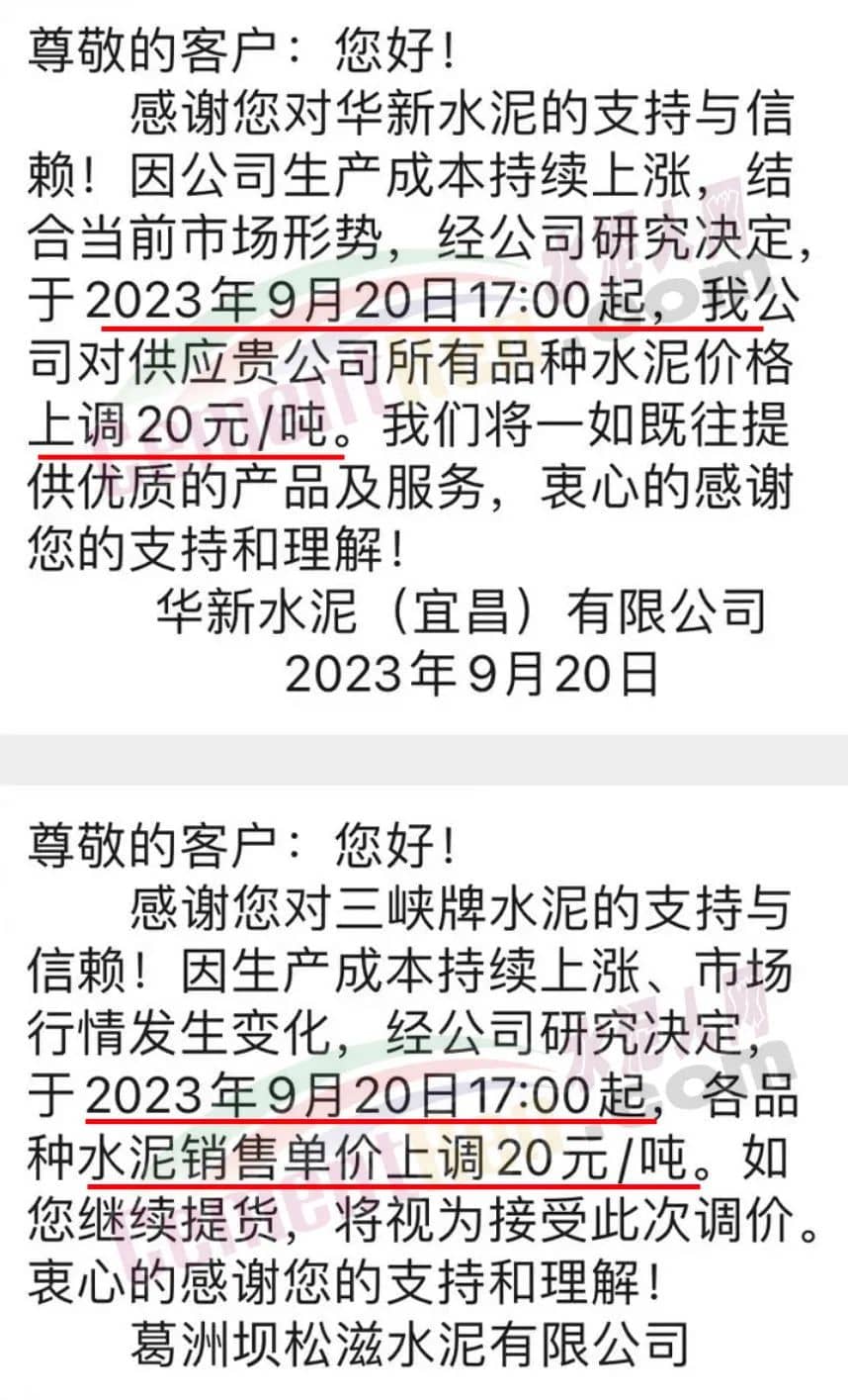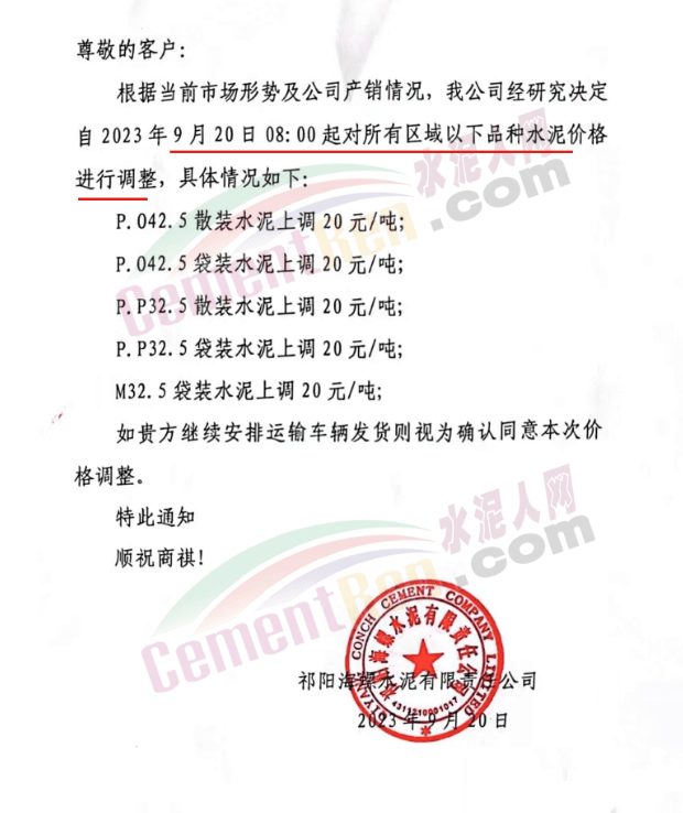 華新水泥(宜昌)公司、葛洲壩松滋水泥通知,因公司生產(chǎn)成本持續(xù)上漲,市場(chǎng)行情發(fā)生變化,經(jīng)公司研究決定于2023年9月20日17:00起,所有品種水泥價(jià)格上調(diào)20元/噸。
