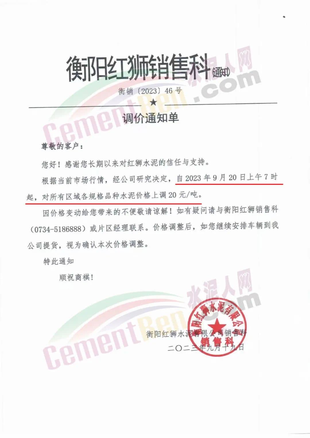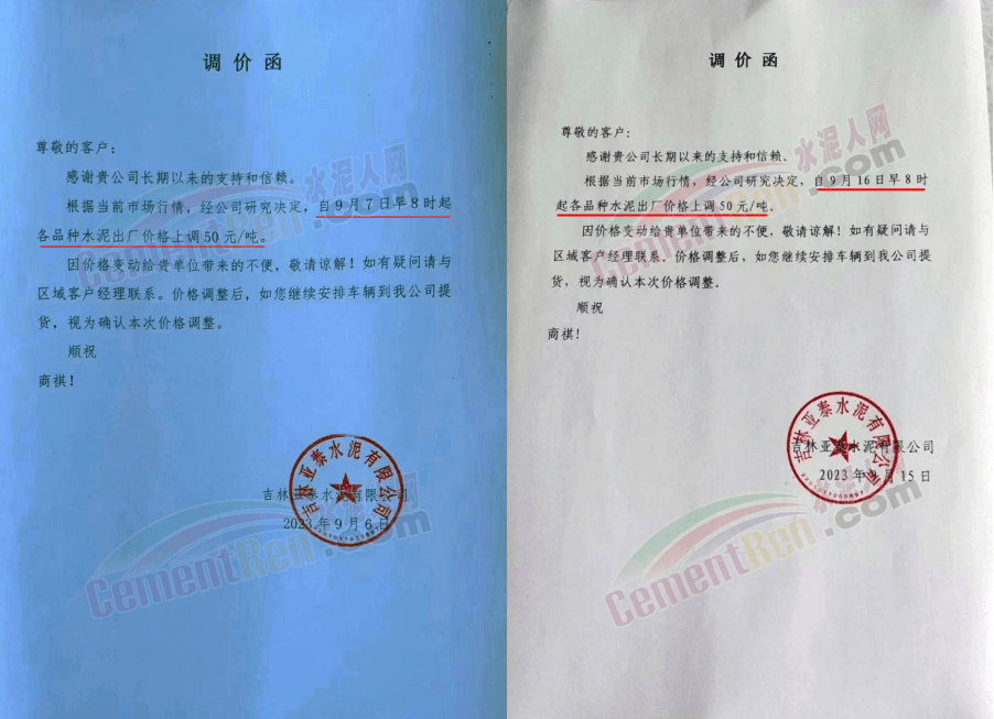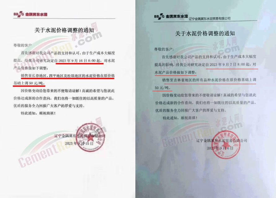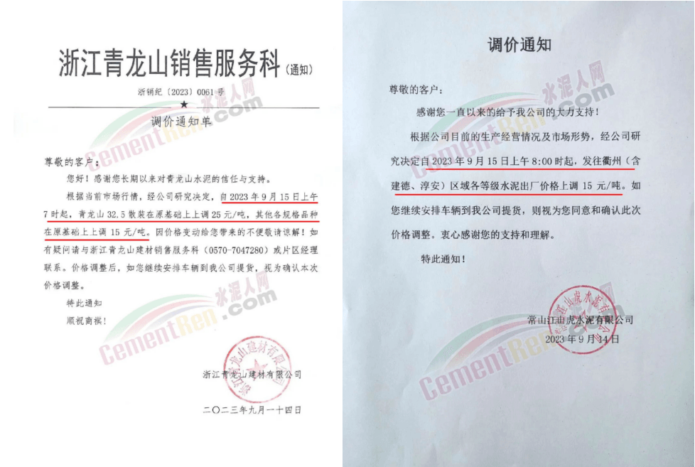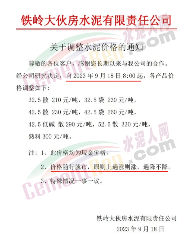 華新水泥(宜昌)公司、葛洲壩松滋水泥通知,因公司生產(chǎn)成本持續(xù)上漲,市場(chǎng)行情發(fā)生變化,經(jīng)公司研究決定于2023年9月20日17:00起,所有品種水泥價(jià)格上調(diào)20元/噸。