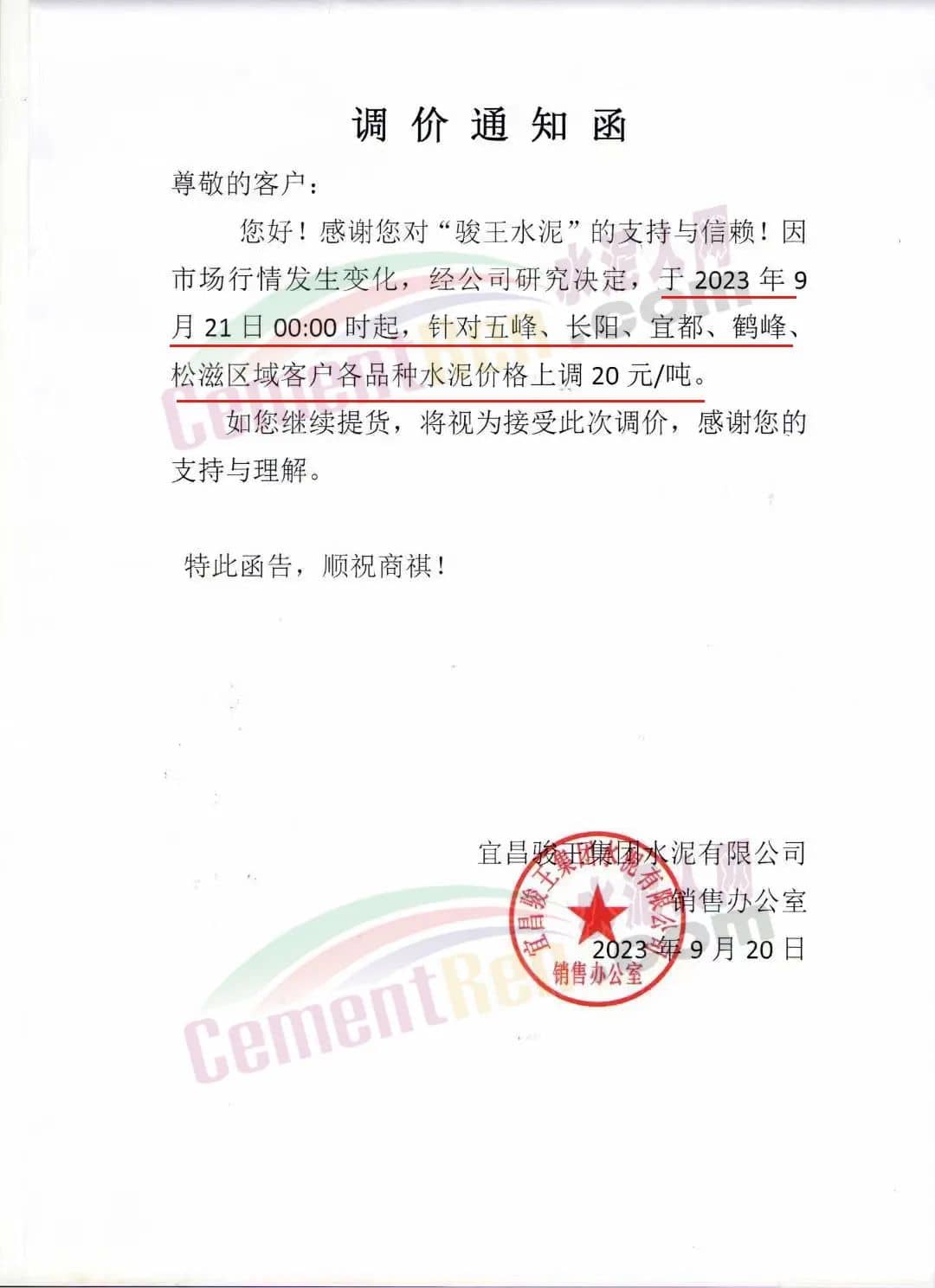 宜昌駿王水泥有限公司通知,因市場(chǎng)行情發(fā)生變化,經(jīng)公司研究決定,于2023年9月21日00:00時(shí)起,針對(duì)五峰、長(zhǎng)陽(yáng)、宜都、鶴峰、松滋區(qū)域客戶各品種水泥價(jià)格上調(diào)20元/噸。