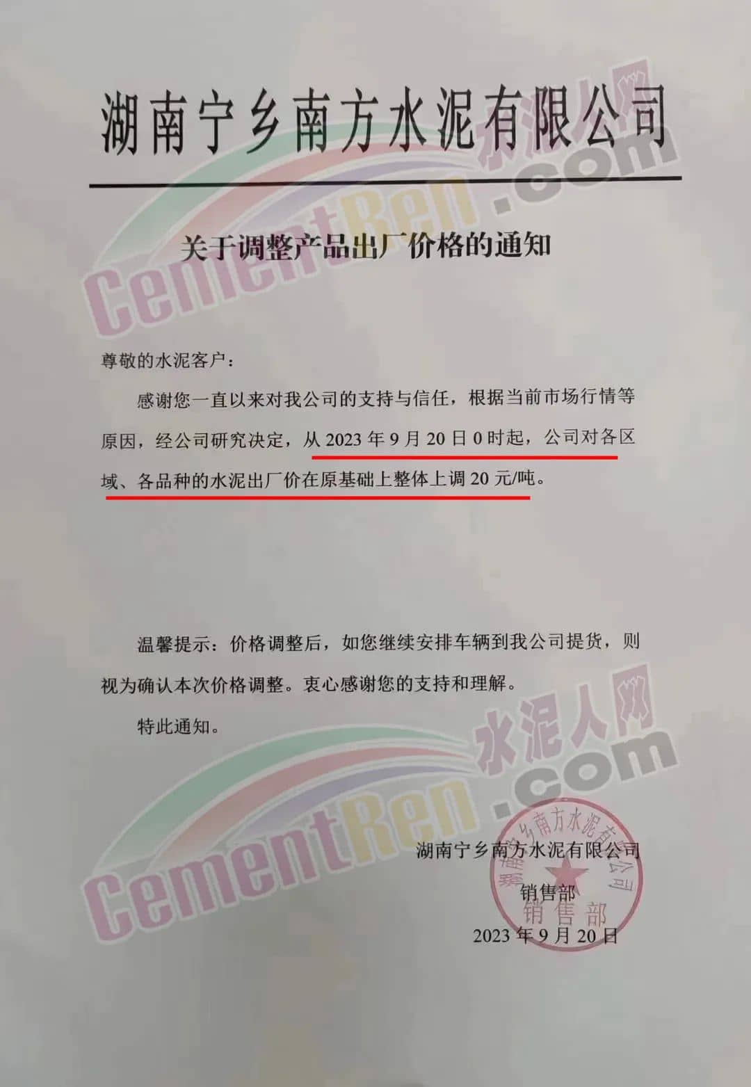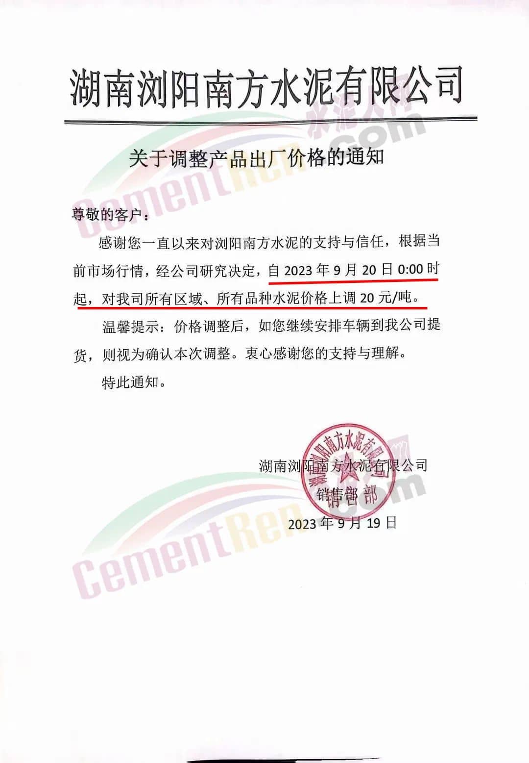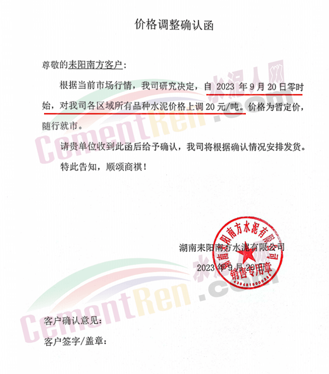 中南水泥旗下耒陽(yáng)南方、寧鄉(xiāng)南方、瀏陽(yáng)南方、桃江南方、坪塘南方、韶峰南方、中材湘潭水泥等多家企業(yè)通知,根據(jù)當(dāng)前市場(chǎng)行情,經(jīng)公司研究決定,從2023年9月20日0時(shí)起,對(duì)各區(qū)域、各品種的水泥出廠價(jià)在原基礎(chǔ)上上調(diào)20~40元/噸。