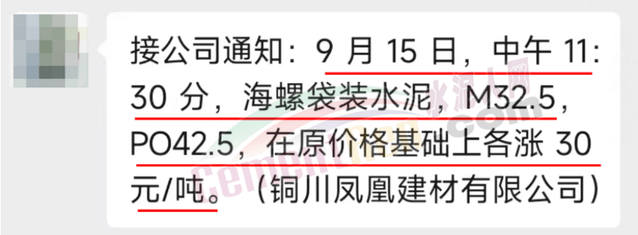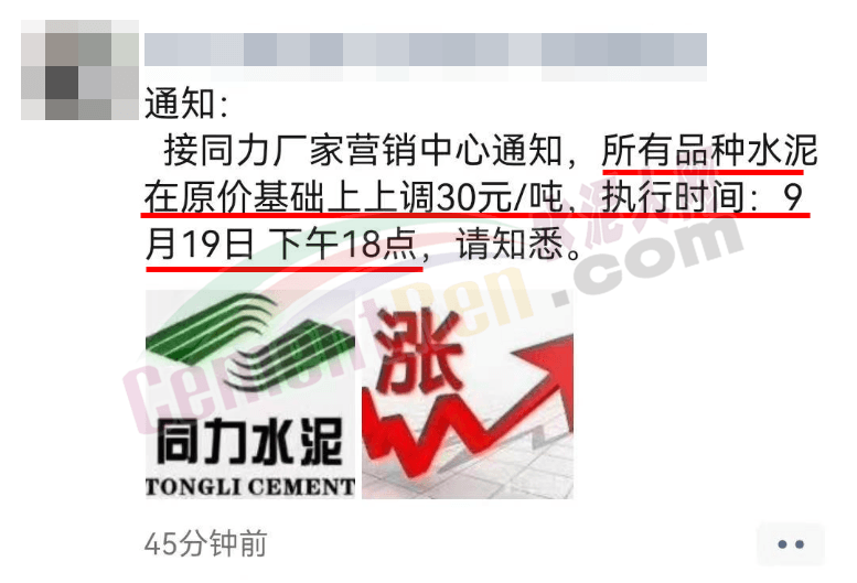 9月19日,河南區(qū)域主要品牌企業(yè)同力水泥、郟縣中聯(lián)水泥分別通知上調(diào)所有品種水泥價(jià)格30元/噸。