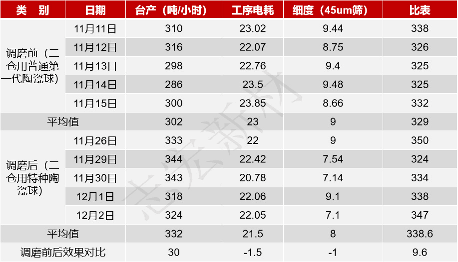 茂鑫HS水泥企業(yè)4.6*14.5米磨機(jī)二倉(cāng)原用普通第一代陶瓷球改用第三代特種陶瓷球后,臺(tái)產(chǎn)提高30.3t/h,增產(chǎn)幅度10%;粉磨工序電耗降低1.5度/噸,下降幅度6.5%;入庫(kù)水泥45μm篩余細(xì)度降低1.0,比表面積提高9.6。