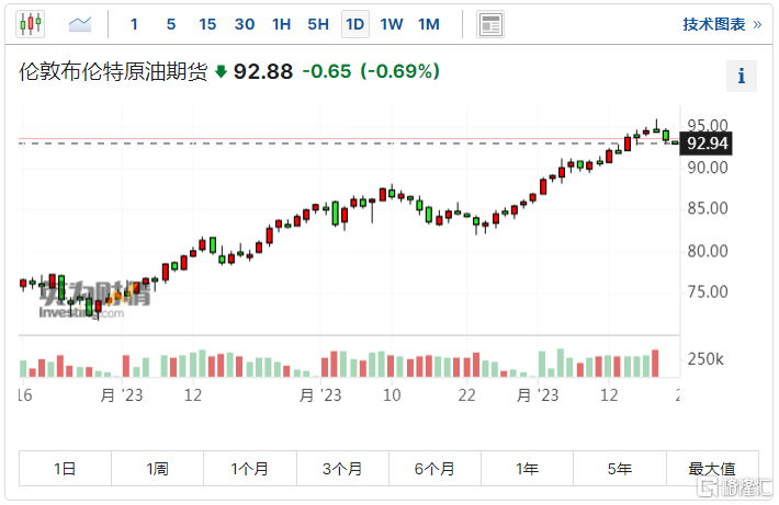 由于沙特阿拉伯和俄羅斯分別宣布延續(xù)減產(chǎn)減供措施,國際石油庫存走低推升了供不應(yīng)求的焦慮心態(tài)。近期國際油價(jià)盤中一度創(chuàng)下10個(gè)月以來新高,美油一度漲至93美元/桶,布油也一度突破95美元/桶。自今年6月以來,布倫特原油價(jià)格累計(jì)上漲超28%。