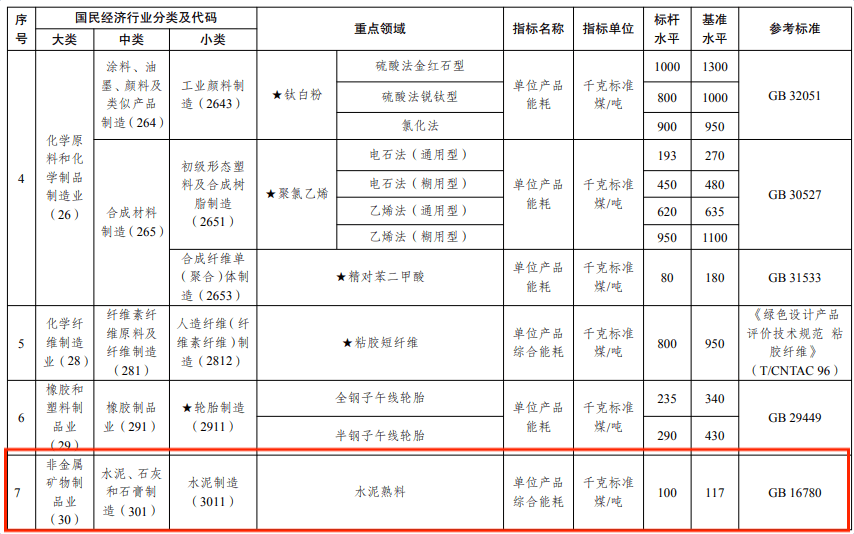 通知中對(duì)此前明確的水泥熟料等25個(gè)領(lǐng)域,原則上應(yīng)在2025年底前完成技術(shù)改造或淘汰退出,并規(guī)定水泥熟料單位產(chǎn)品綜合能耗標(biāo)桿水泥為100千克標(biāo)準(zhǔn)煤/噸,基準(zhǔn)水平為117千克標(biāo)準(zhǔn)煤/噸。