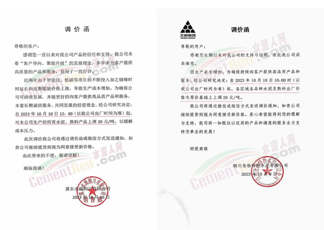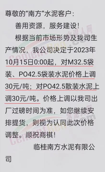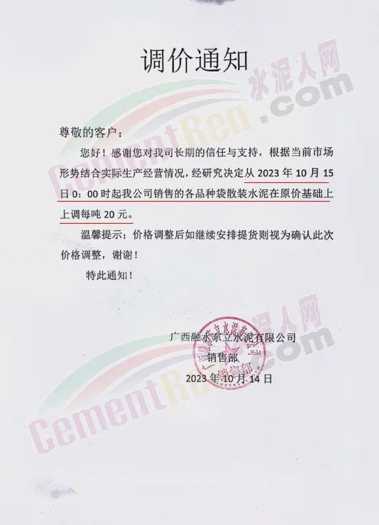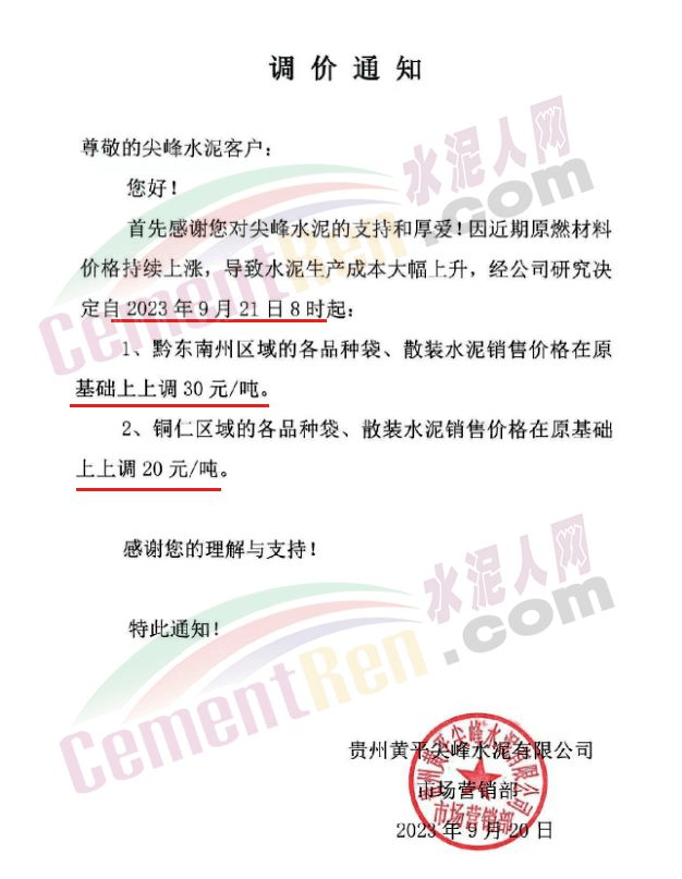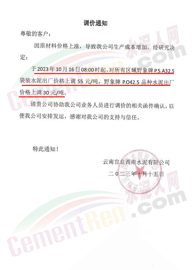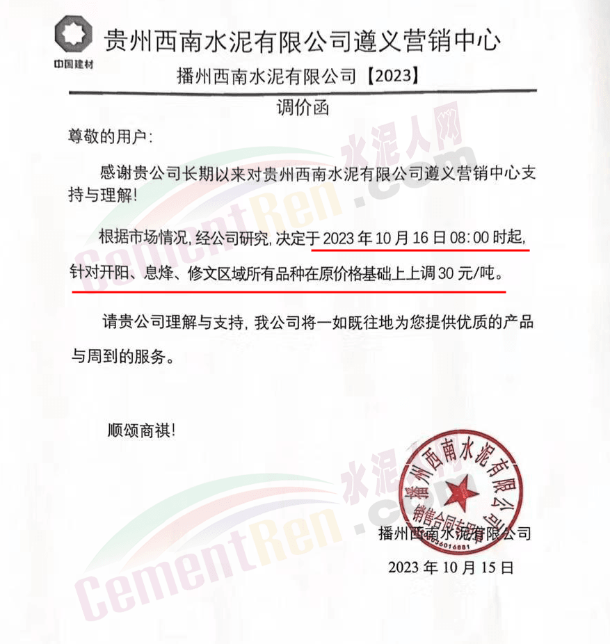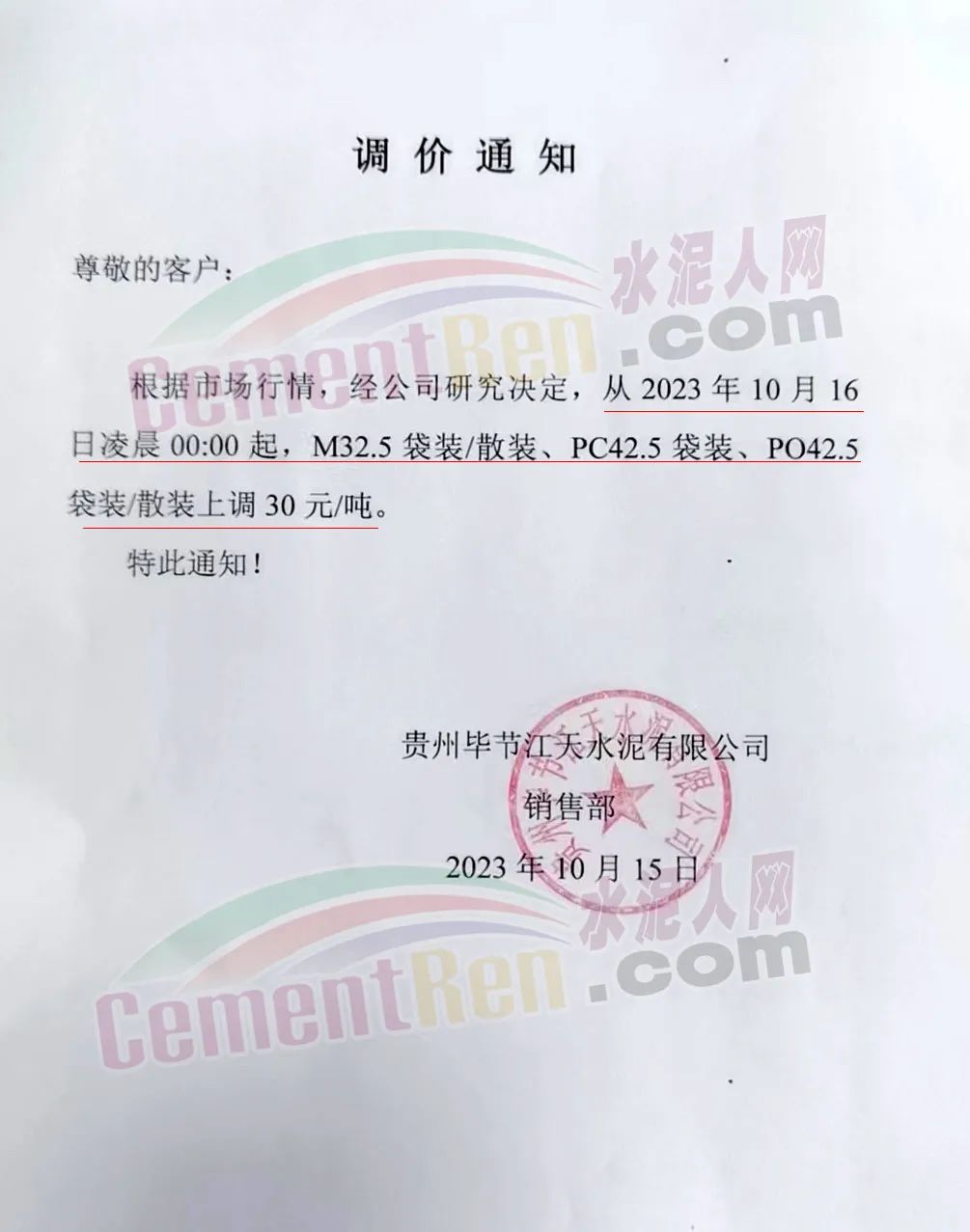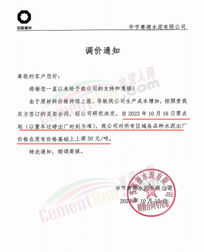 畢節(jié)賽德水泥有限公司通知,由于原材料價格持續(xù)上漲,導(dǎo)致公司生產(chǎn)成本增加,經(jīng)公司研究決定,自2023年10月16日零點起,對所有區(qū)域各品種水泥出廠價格在原有價格基礎(chǔ)上上調(diào)30元/噸。