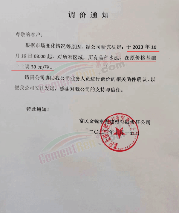 富民金銳水泥建材有限責(zé)任公司通知,根據(jù)市場變化情況等原因,經(jīng)公司研究決定,于2023年10月16日8時起,對所有區(qū)域,所有品種水泥,在原價格基礎(chǔ)上上調(diào)30元/噸。