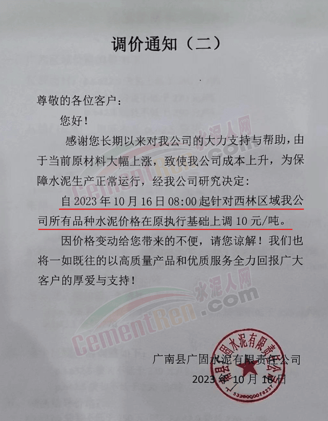 云南文山州廣南縣廣固水泥有限公司通知,由于當(dāng)前原材料大幅上漲,致使公司成本上升,為保障水泥生產(chǎn)正常運(yùn)行,經(jīng)公司研究決定,自2023年10月16日8時起,對西林區(qū)域我公司所有品種水泥價格在原執(zhí)行基礎(chǔ)上調(diào)10元/噸。
