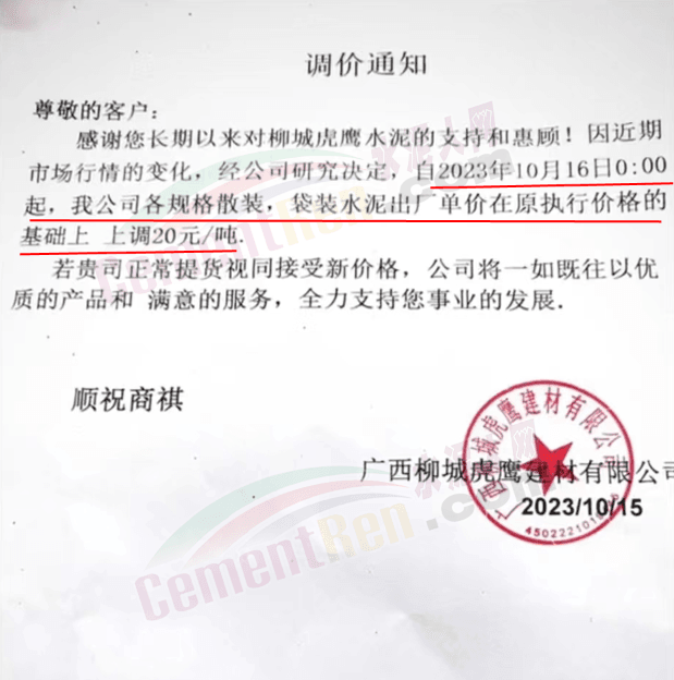 廣西柳城虎鷹建材有限公司通知,因近期市場行情的變化,經(jīng)公司研究決定,自2023年10月16日0時起,公司各規(guī)格散裝,袋裝水泥出廠單價在原執(zhí)行價格基礎(chǔ)上上調(diào)20元/噸。