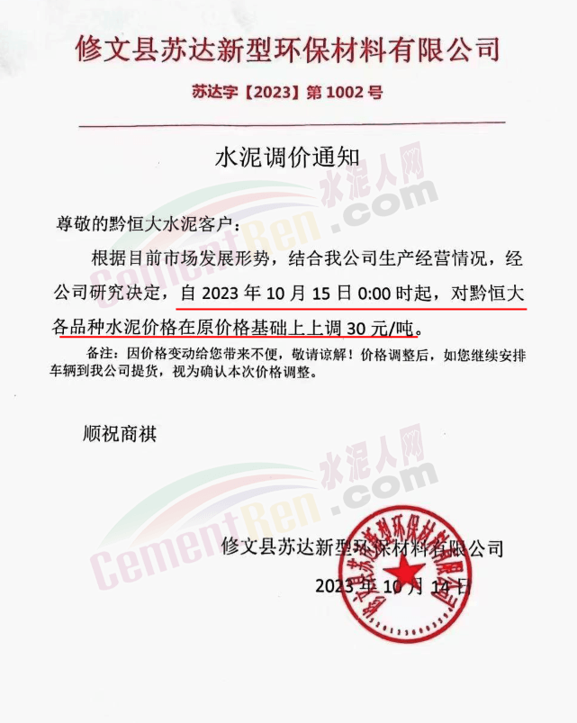 廣西桂林修文縣蘇達(dá)新型環(huán)保材料有限公司通知,根據(jù)目前市場發(fā)展形勢,結(jié)合公司生產(chǎn)經(jīng)營情況,經(jīng)公司研究決定,自2023年10月15日0時起,對黔恒大各品種水泥價格在原價格基礎(chǔ)上上調(diào)30元/噸。