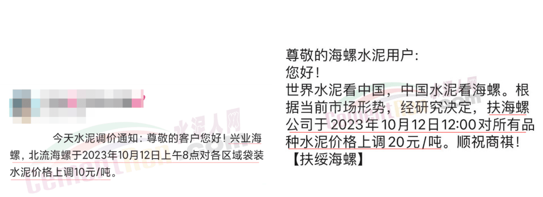 廣西新建線企業(yè)錦象水泥通知,因原材料價格上漲,導(dǎo)致公司成本增加,經(jīng)研究決定,于2023年10月14日起,各品種包、散水泥價格上調(diào)20元/噸。