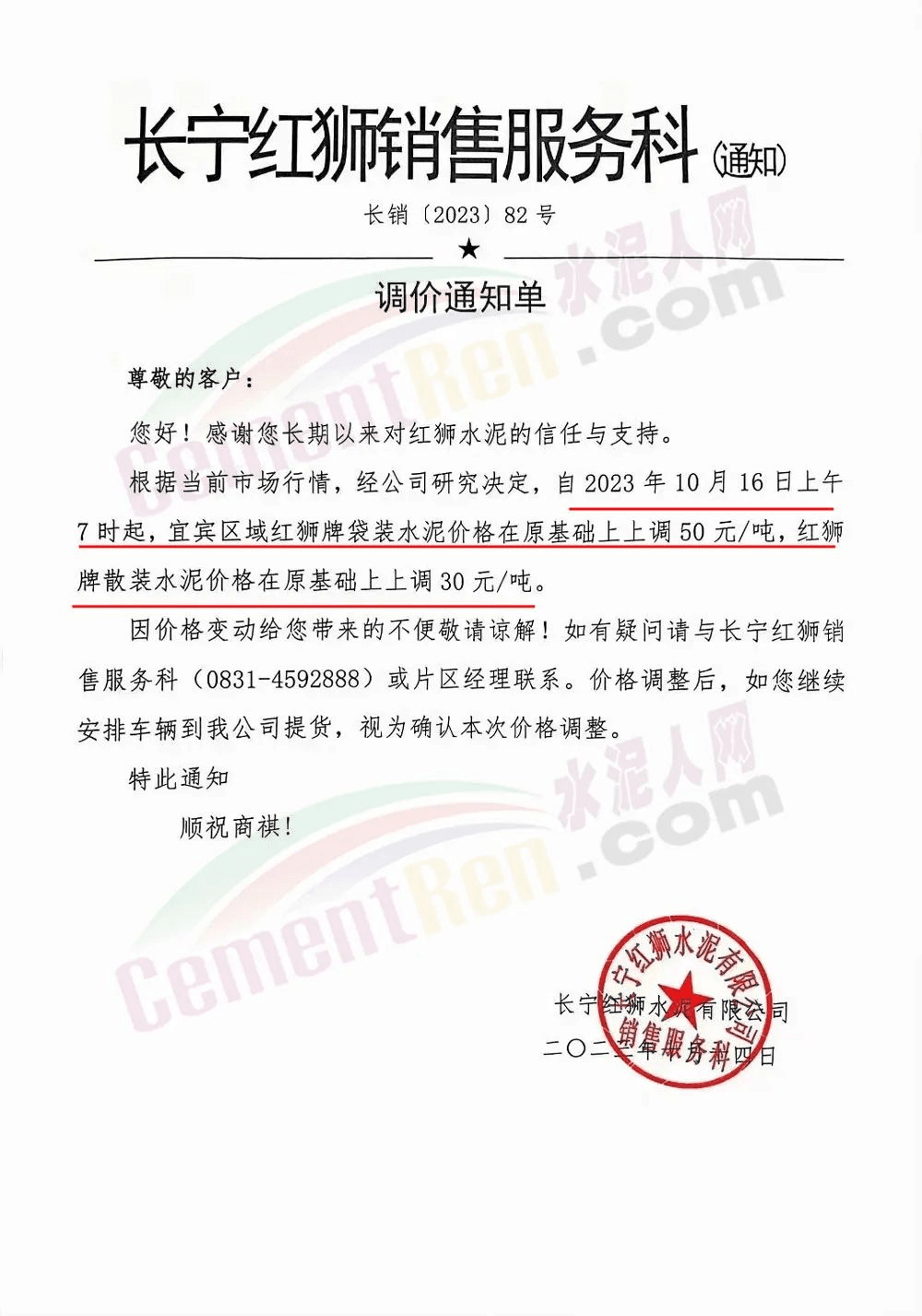 15日前后,四川區(qū)域主要品牌企業(yè)紅獅、西南等主要品牌企業(yè)通知上調(diào)水泥報價30-50元/噸。四川長寧紅獅銷售服務(wù)科通知,自2023年10月16日起,宜賓區(qū)域紅獅牌水泥上調(diào)30-50元/噸。