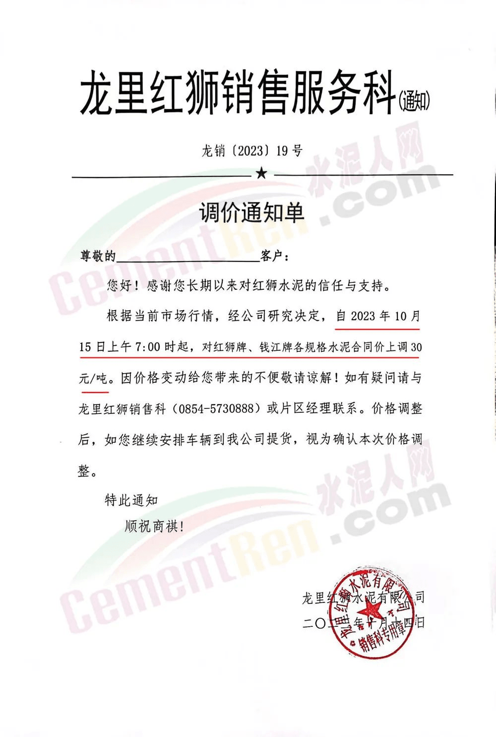 紅獅水泥旗下祥云建云水泥有限公司銷售科通知,根據(jù)當(dāng)前市場行情,經(jīng)公司研究決定,自2023年10月16日上午7時起,楚雄片區(qū)(含攪拌站)錢江牌、紅獅牌各規(guī)格水泥價格上調(diào)30元/噸。